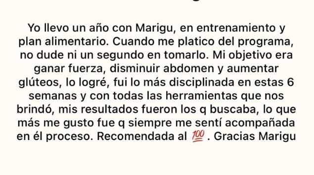 Gracias a Coach Marigú, he mejorado mi fuerza y bienestar mientras disfruto de una alimentación deliciosa.
